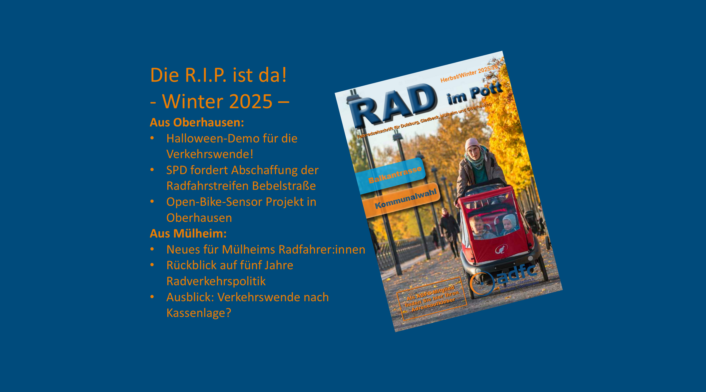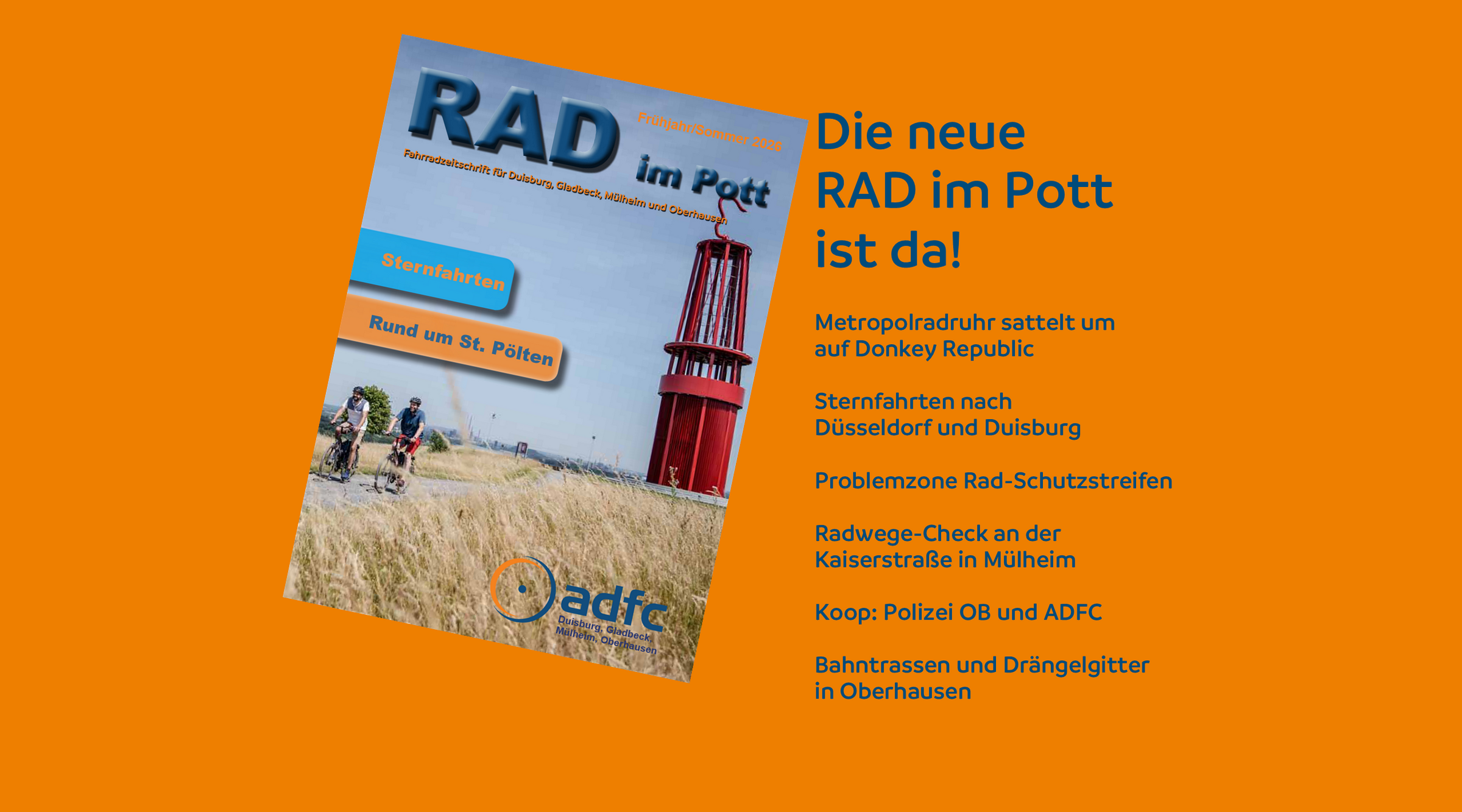 weiterlesenDer Allgemeine Deutsche Fahrrad-Club e.V. (ADFC) ist mit bundesweit mehr als 190.000 Mitgliedern, die größte Interessenvertretung der Radfahrerinnen und Radfahrer in Deutschland und weltweit. Über 1.000 Mitglieder hat der KV Oberhausen/Mülheim! Politisch engagiert sich der ADFC auf regionaler, nationaler und internationaler Ebene für die konsequente Förderung des Radverkehrs. Er berät in allen Fragen rund ums Fahrrad: Recht, Technik, Tourismus.