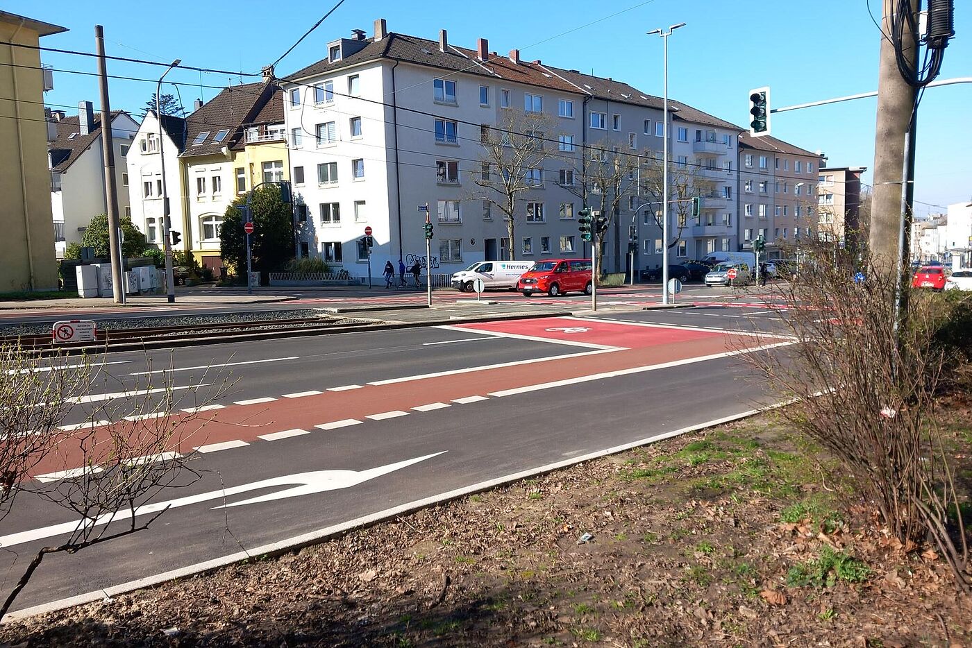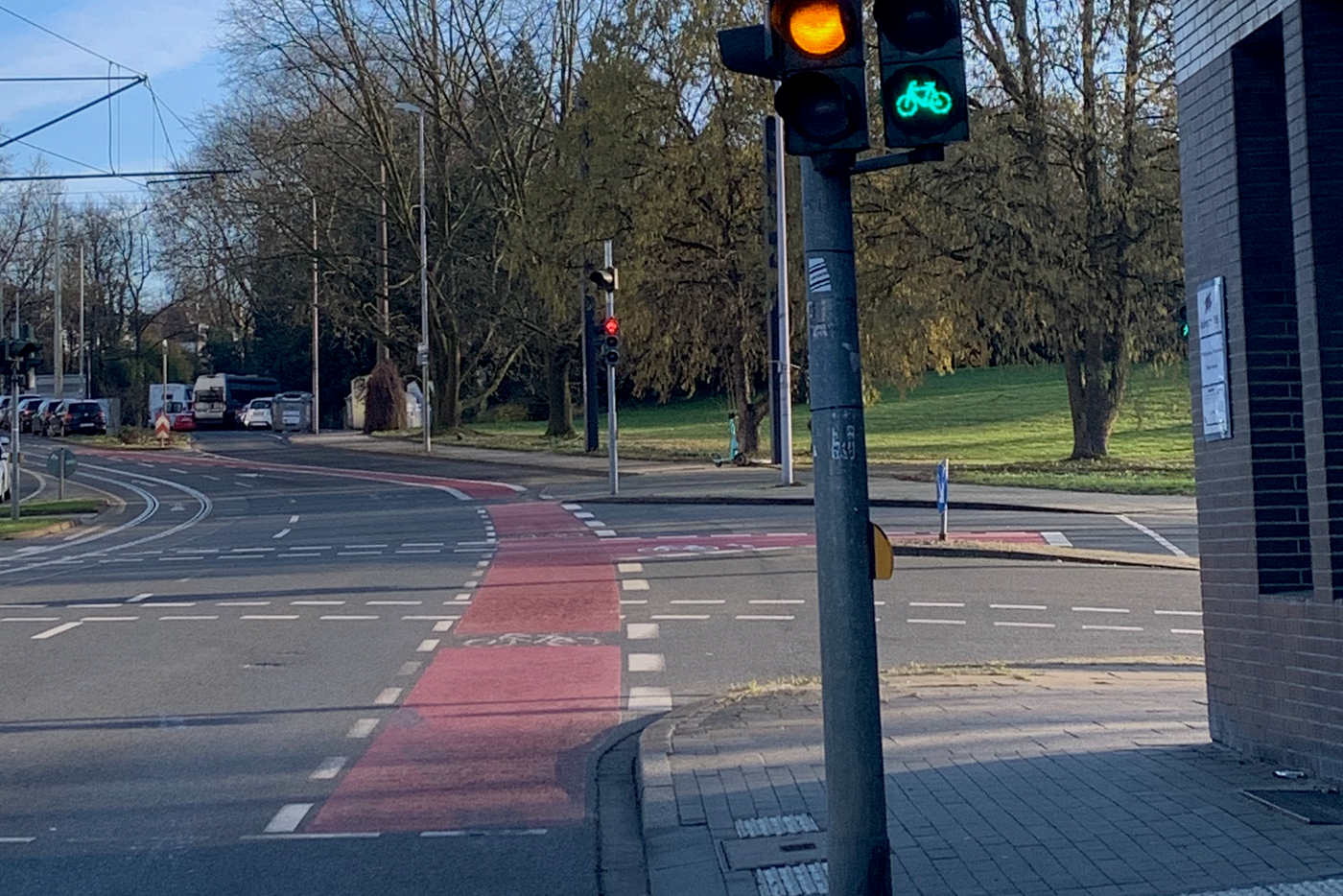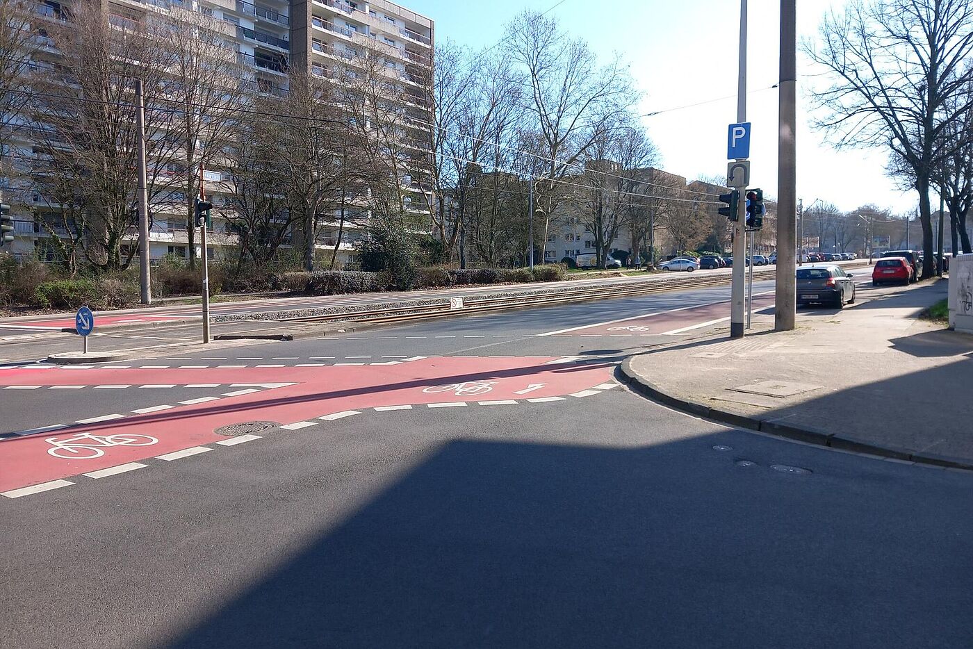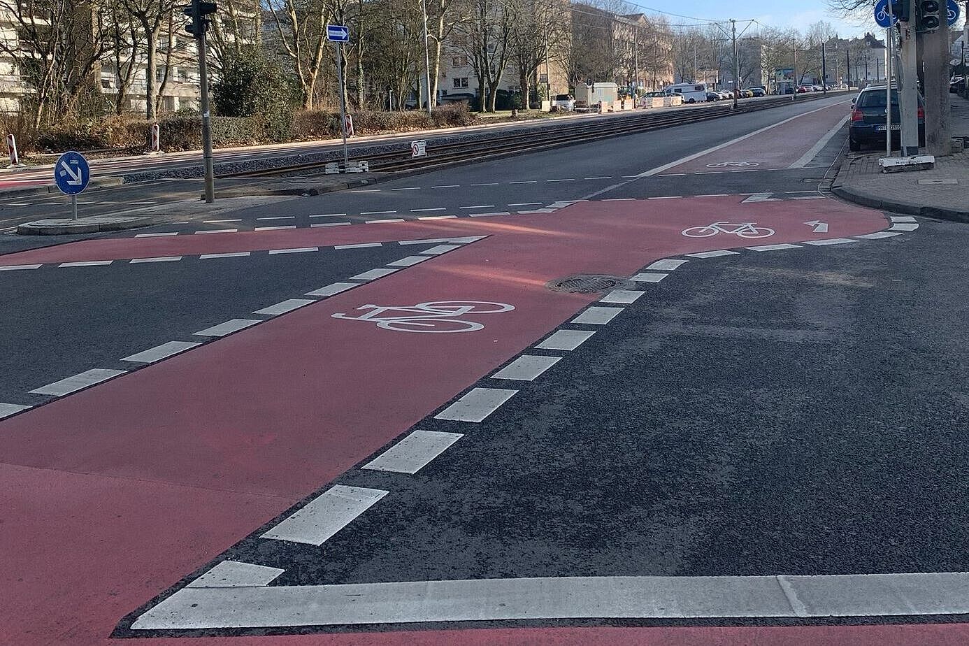 Anders als in den ersten Plänen hat man den stadtauswärts führenden zu schmalen Dooringstreifen bis zur Einmündung des Straßenzugs Hagdorn/Lohscheidt verbreitert. Hier ist der Kreuzungsbereich für links zu den Sportstätten in die Südstraße abbiegende Radfahrende allerdings schwierig: „gegenüber“ gibt es am fernen Mast des querenden Fußgängerüberwegs (mit Verkehrsinsel) zwar eine Fahrradampel. Allerdings kann man auf der Aufstellfläche quasi auf halber Strecke „verhungern“, wenn nicht zufällig auch Zufußgehende queren!