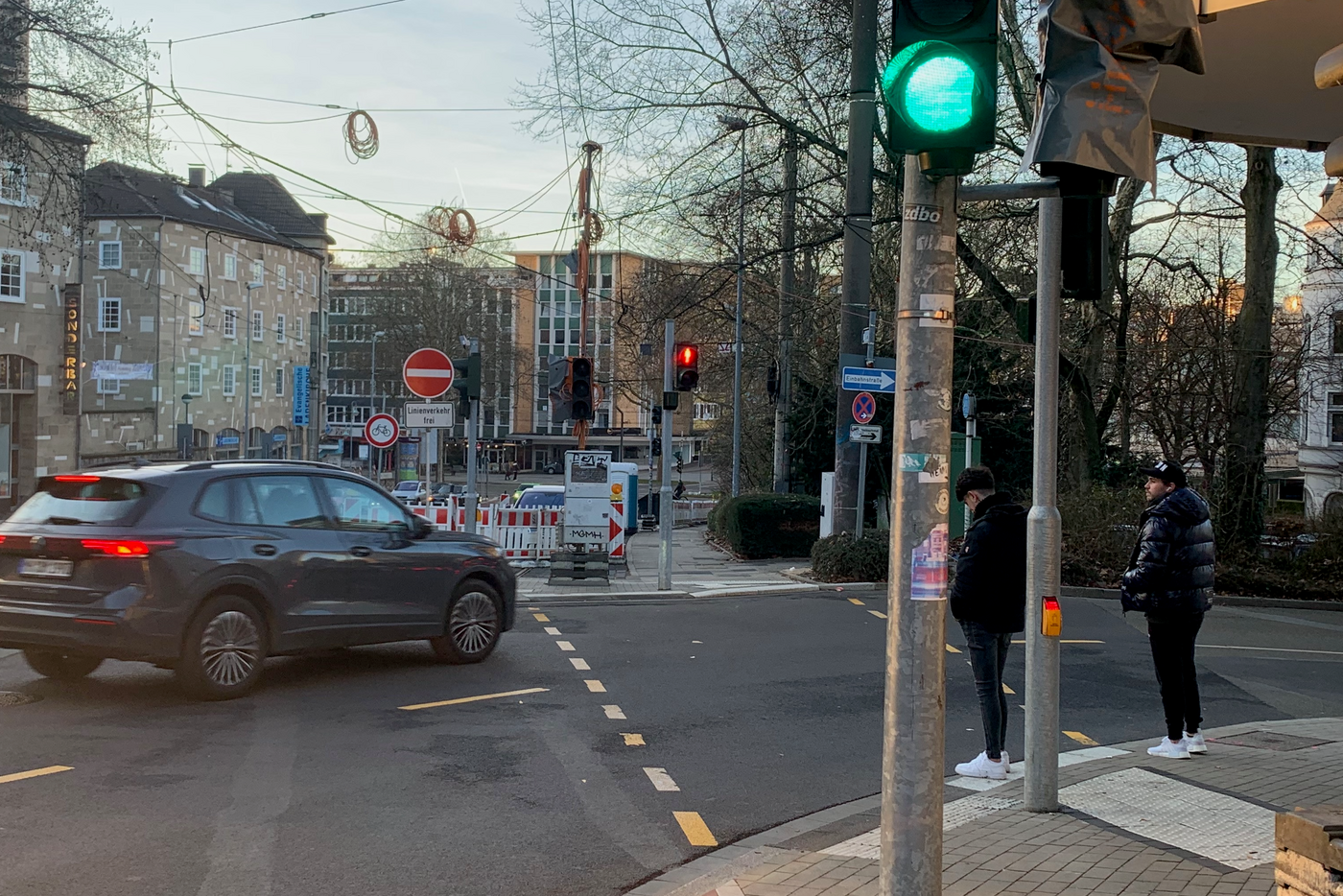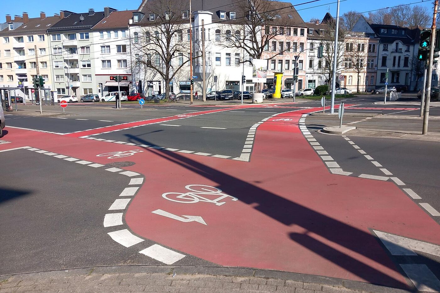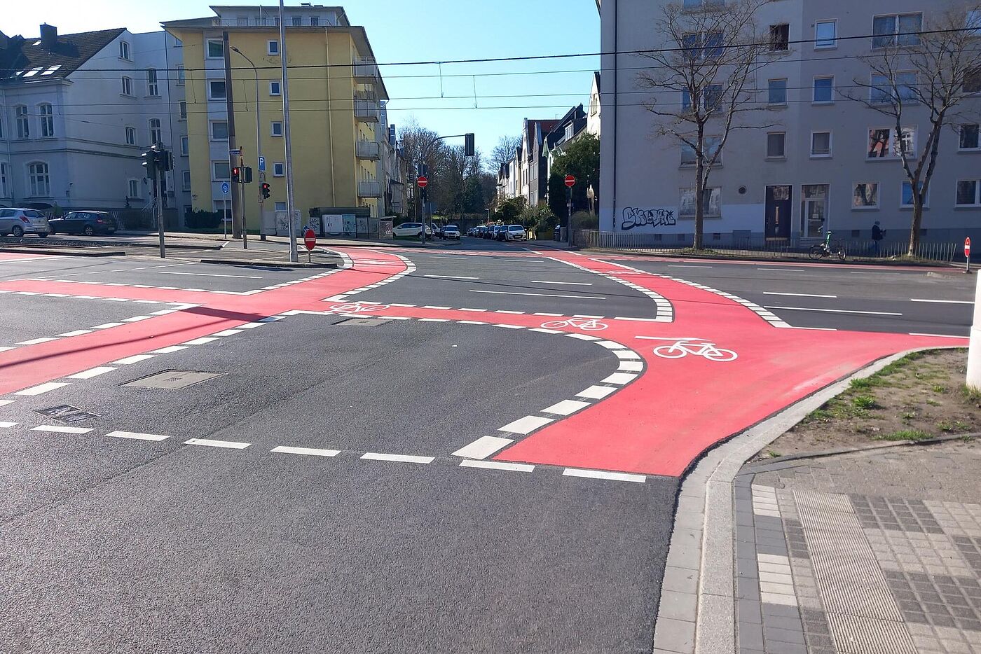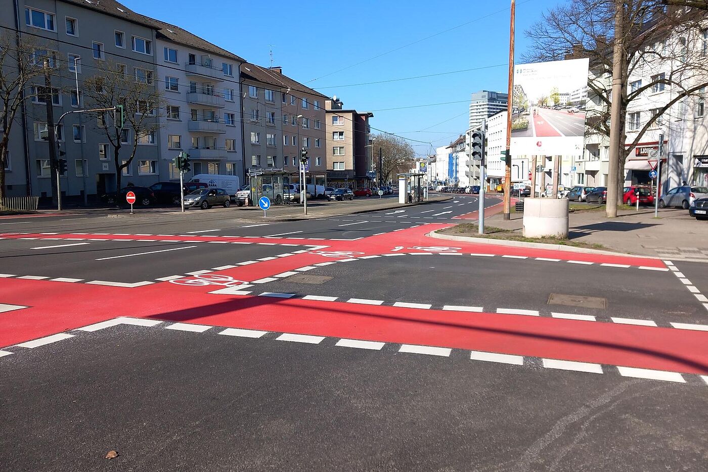 Anders als in den ersten Plänen hat man den stadtauswärts führenden zu schmalen Dooringstreifen bis zur Einmündung des Straßenzugs Hagdorn/Lohscheidt verbreitert. Hier ist der Kreuzungsbereich für links zu den Sportstätten in die Südstraße abbiegende Radfahrende allerdings schwierig: „gegenüber“ gibt es am fernen Mast des querenden Fußgängerüberwegs (mit Verkehrsinsel) zwar eine Fahrradampel. Allerdings kann man auf der Aufstellfläche quasi auf halber Strecke „verhungern“, wenn nicht zufällig auch Zufußgehende queren!