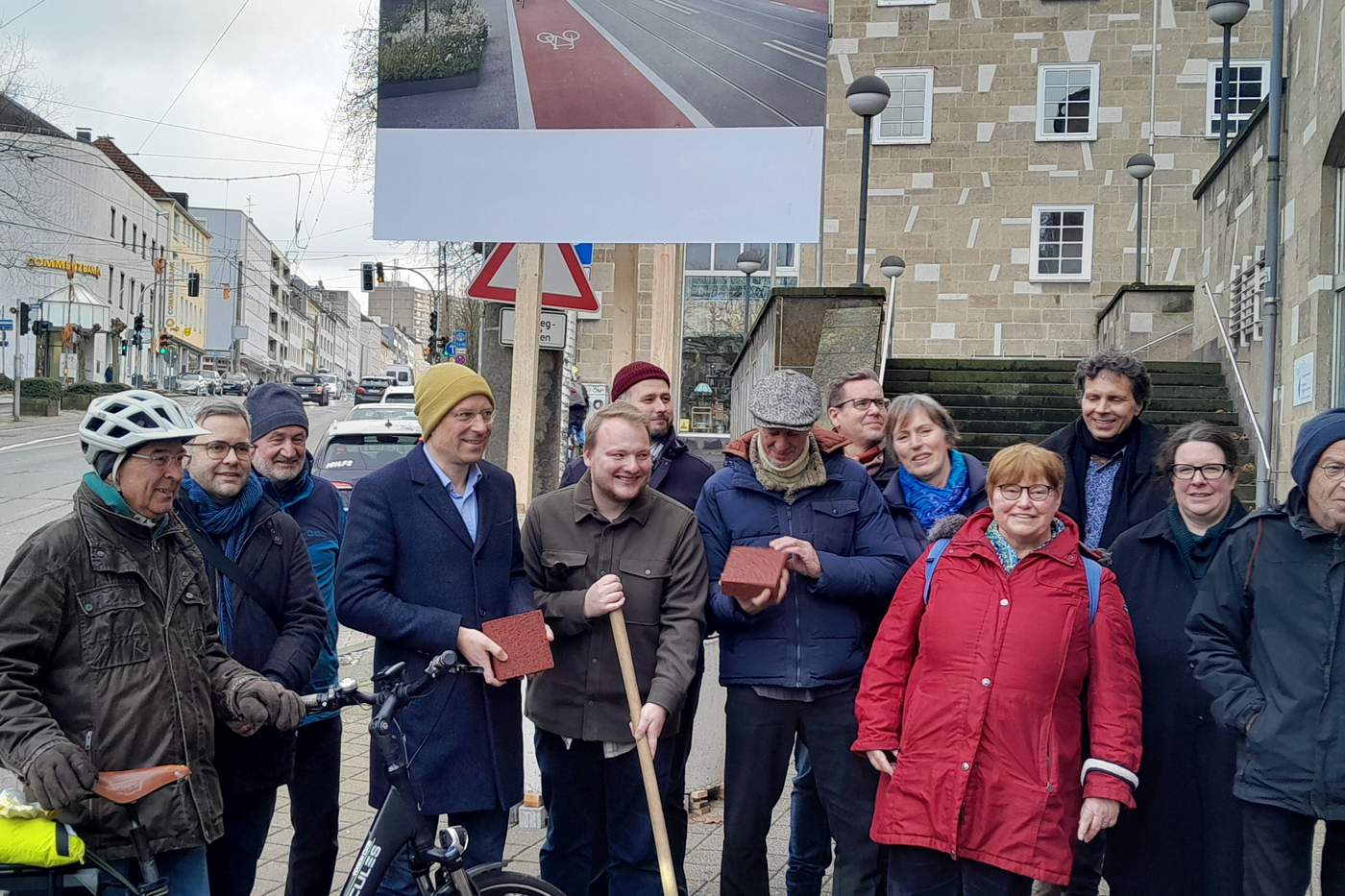 Der 20. Dezember 2024 war dann ein hoffnungsvoller Tag für Radfahrende in Mülheim an der Ruhr: Kein echter „Spatenstich“, aber immerhin wurde das Baustellenschild am Altenhof „gefeiert“. In Anwesenheit des Bezirksbürgermeisters, des Baudezernenten, von Ratsmitgliedern und dem Vorsitzenden des Mobilitätsausschusses präsentierten die Straßenplaner Muster der rot eingefärbten Steine und es wurde mit einem symbolischen Spaten hantiert. Auch der Radverkehrsbeauftragte und der Nahmobilitätsmanager sowie aus dem Arbeitskreis „Fahrrad- und Fußgängerfreundliches Mülheim“ Vertreter von Fuß e.V., Verkehrswacht und natürlich dem ADFC lächelten in die Kameras.