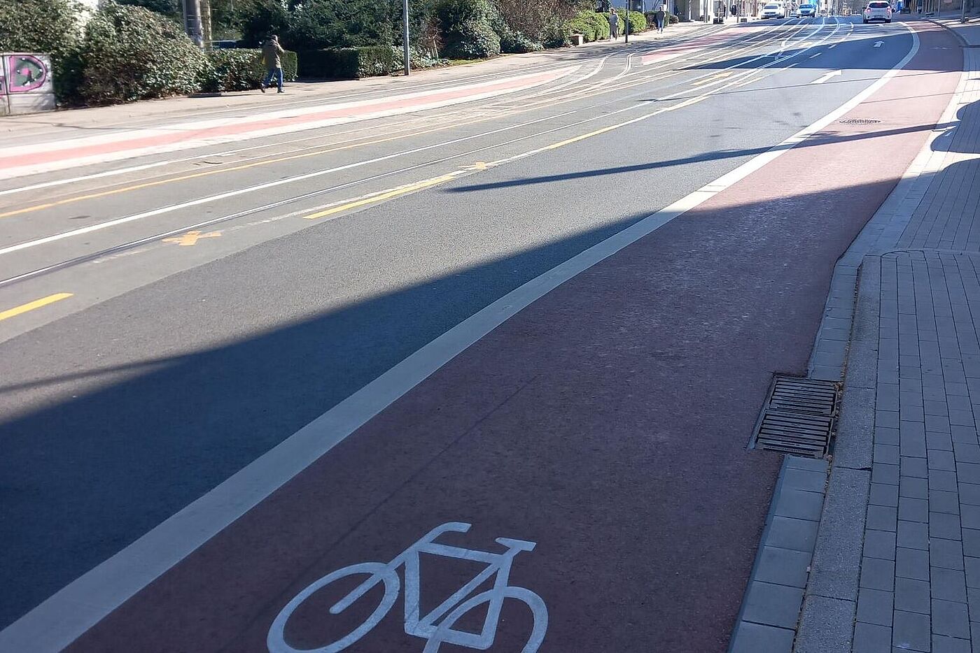 Nun schreiben wir das Jahr 2026, optisch macht die Strecke bereits nachhaltigen Eindruck: Das Signal-Rot des „holländischen Asphalts“ und die Breite der Radstreifen gefallen schon optisch den ersten „Usern“. Also müssen die Faktoren getestet werden, die dem Radverkehr mehr an Sicherheit, Komfort und Fahrtempo bieten, denn wir wollen bald Gruppen jeder Art von Schülerinnen und Schülern sehen, für die es selbstverständlich geworden ist, per Fahrrad zum Unterricht zu kommen.