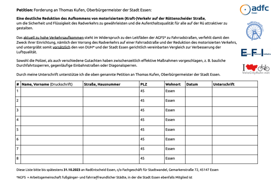 Die Tatenlosigkeit von Politik und Verwaltung wollen wir nicht akzeptieren. Gemeinsam mit den anderen Essener Radverkehrsinitiativen haben wir deshalb die Petition an Oberbürgermeister Thomas Kufen gestartet.