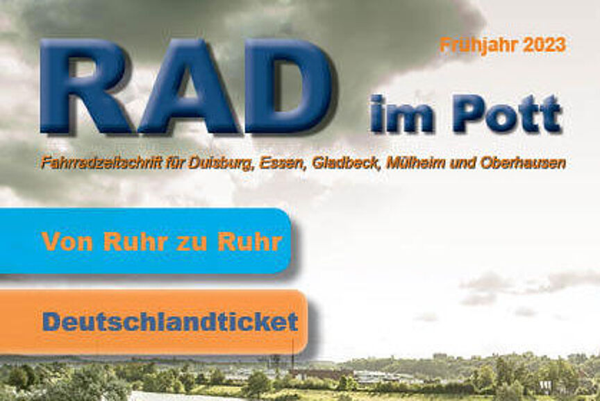 "Rad im Pott": unsere regionale Zeitschrift erscheint dreimal jährlich kostenlos mit Berichten zur Verkehrspolitik, mit Tipps, Infos und dem Tourenprogramm. Sie ist in vielen Geschäften und den Radstationen an den Bahnhöfen Oberhausen, Mülheim und Styrum erhältlich: