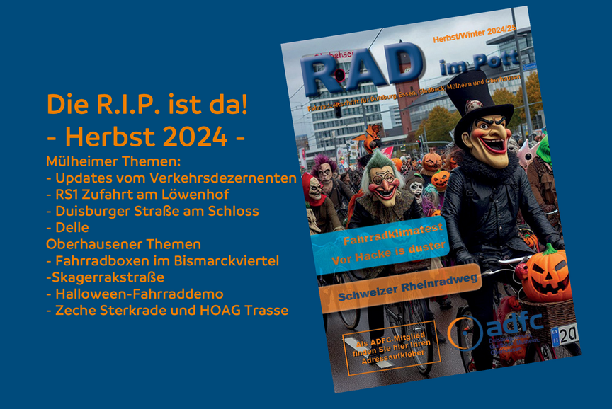 Unsere regionale Radzeitung Rad im Pott ist bei unseren Mitgliedern im Briefkasten und in vielen fahrradfreundlichen Läden ausgelegt.